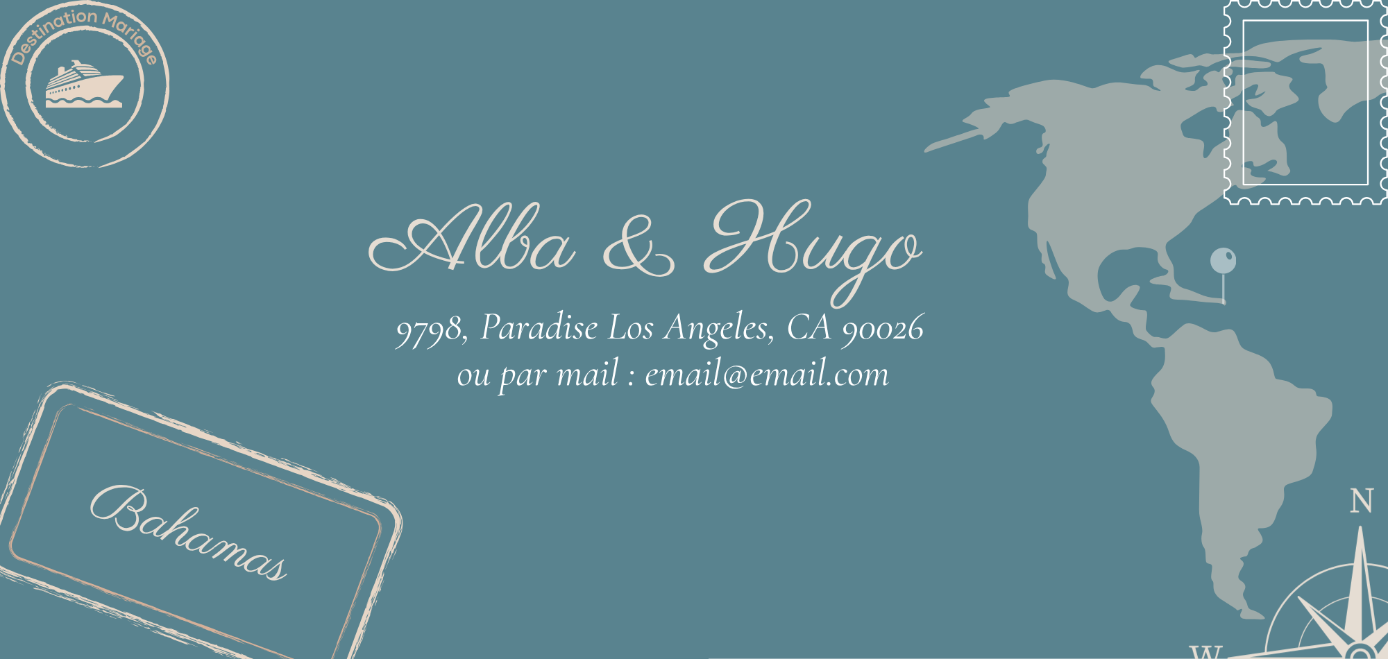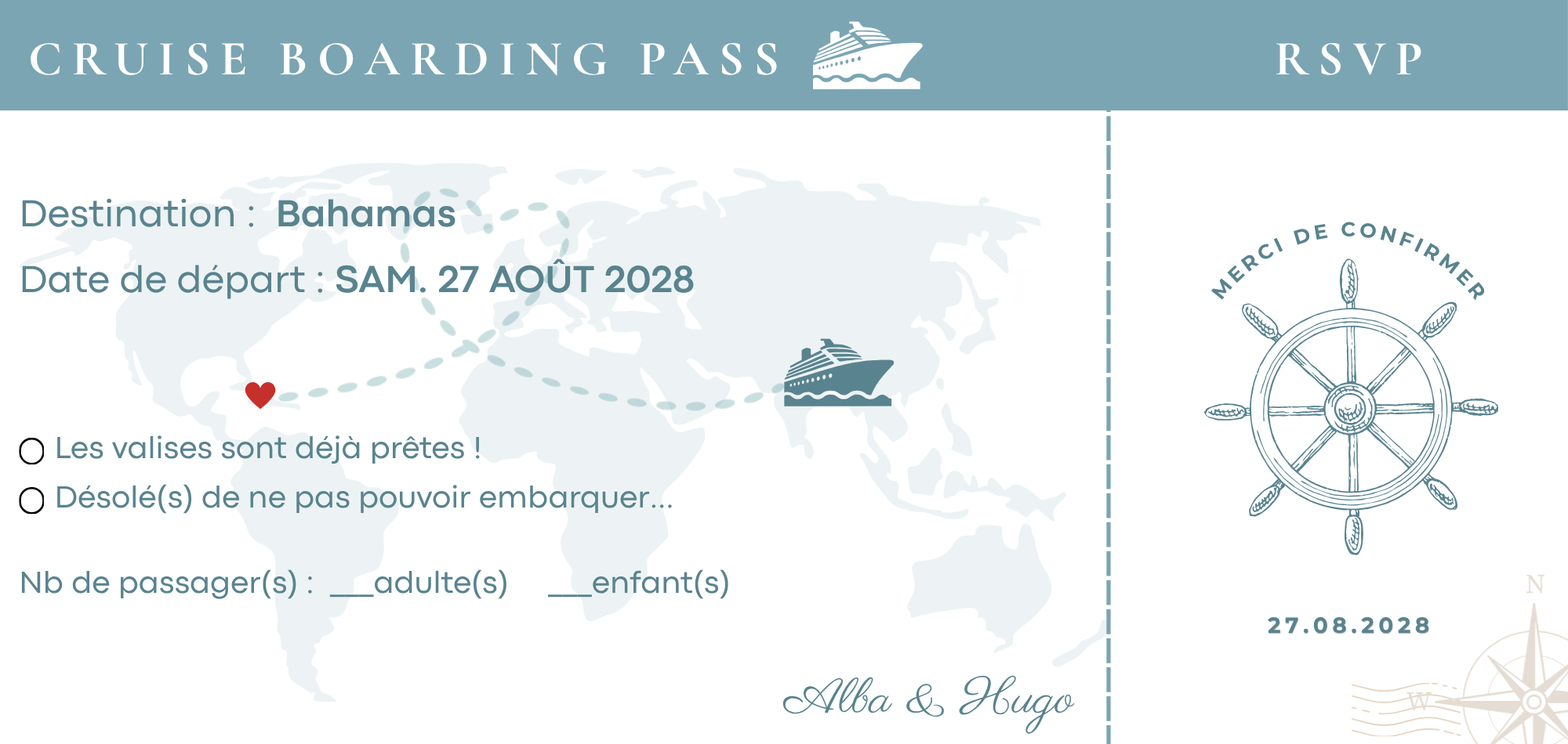 Pour cette déclinaison Croisière Bahamas, j’ai imaginé une identité visuelle complète autour du thème nautique, bleu ardoise, blanc nacré, touches de sable. Un boarding pass en guise d’invitation, un passeport pour le programme, un carton avec carte du monde. Chaque pièce raconte le voyage avant même qu’il commence.