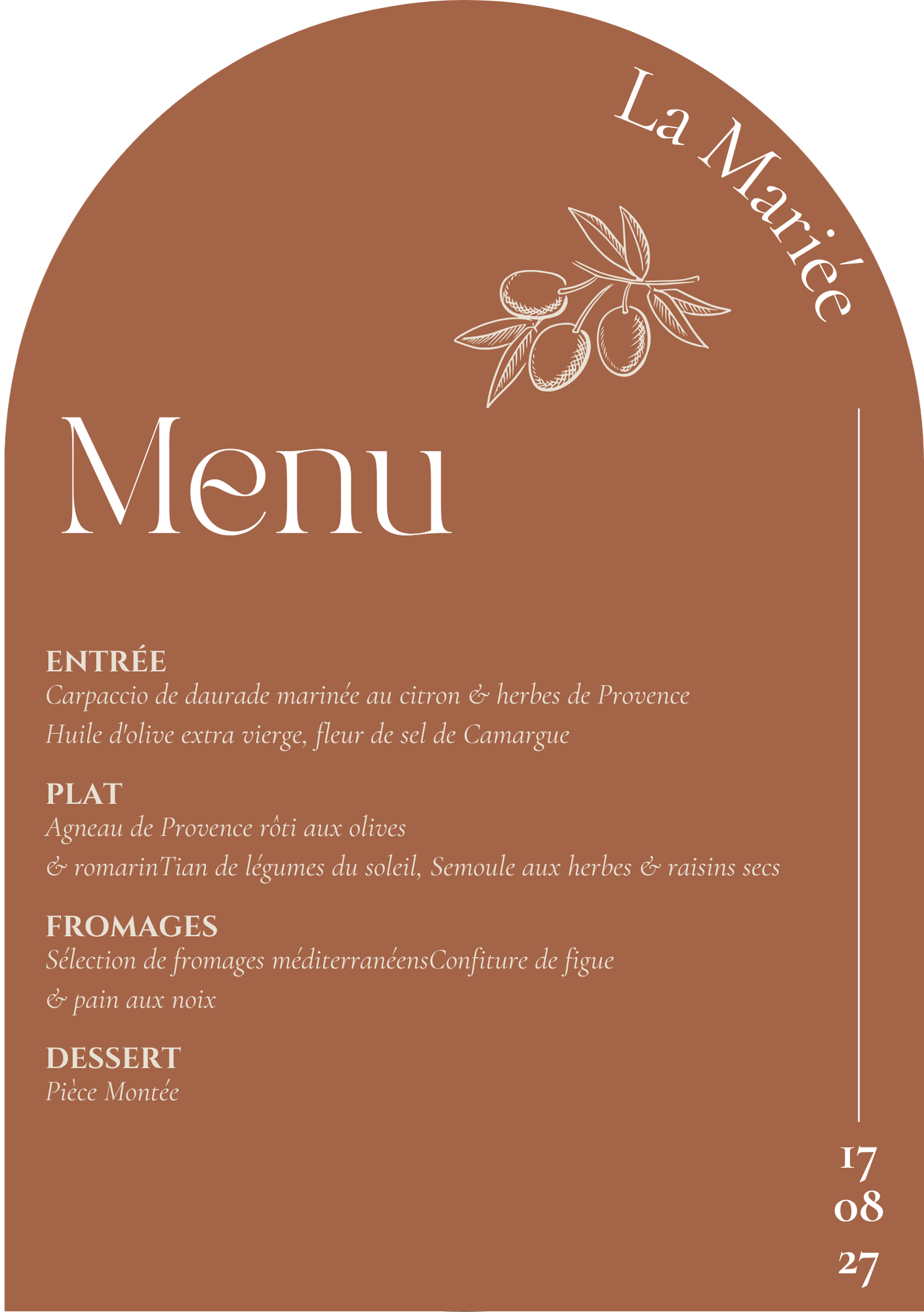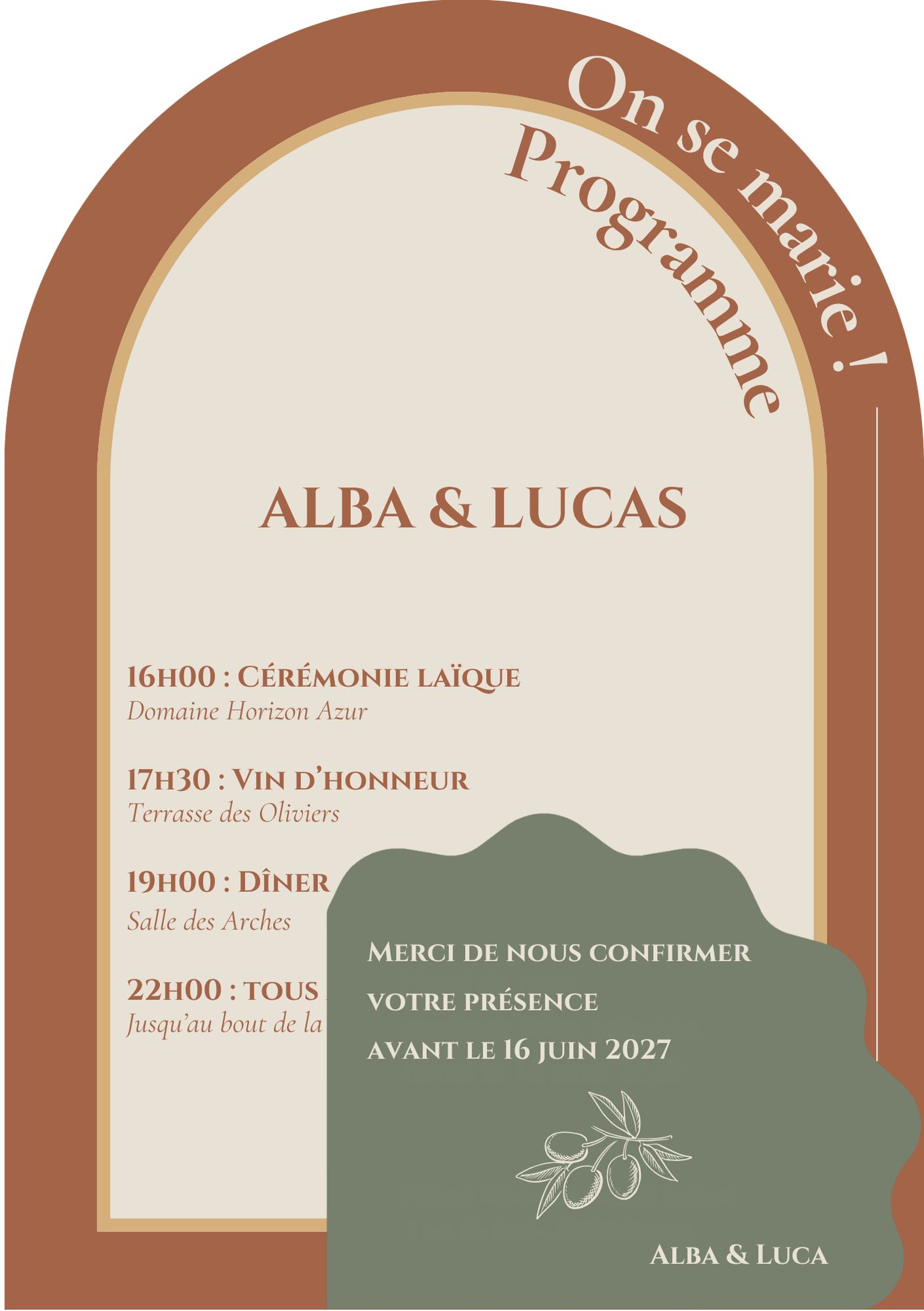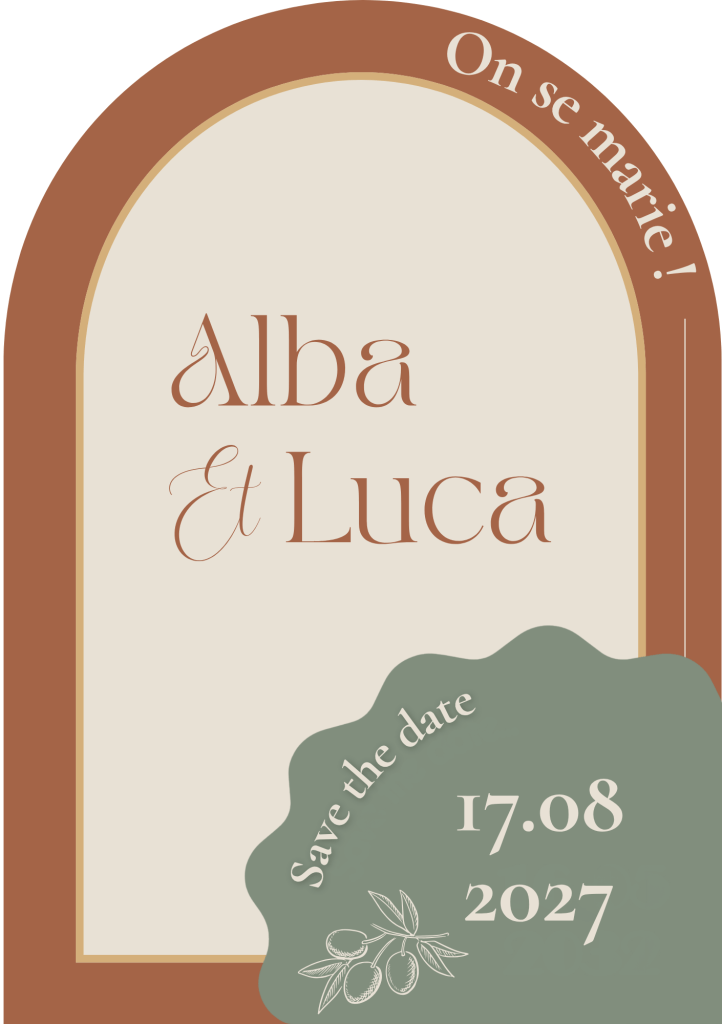 L’univers de la collection : faire-part, save the date, programme, menu, marque-places — chaque pièce porte la même chaleur, la même cohérence. Des arches, des motifs botaniques, une typographie élégante entre Cinzel et Cormorant Garamond.